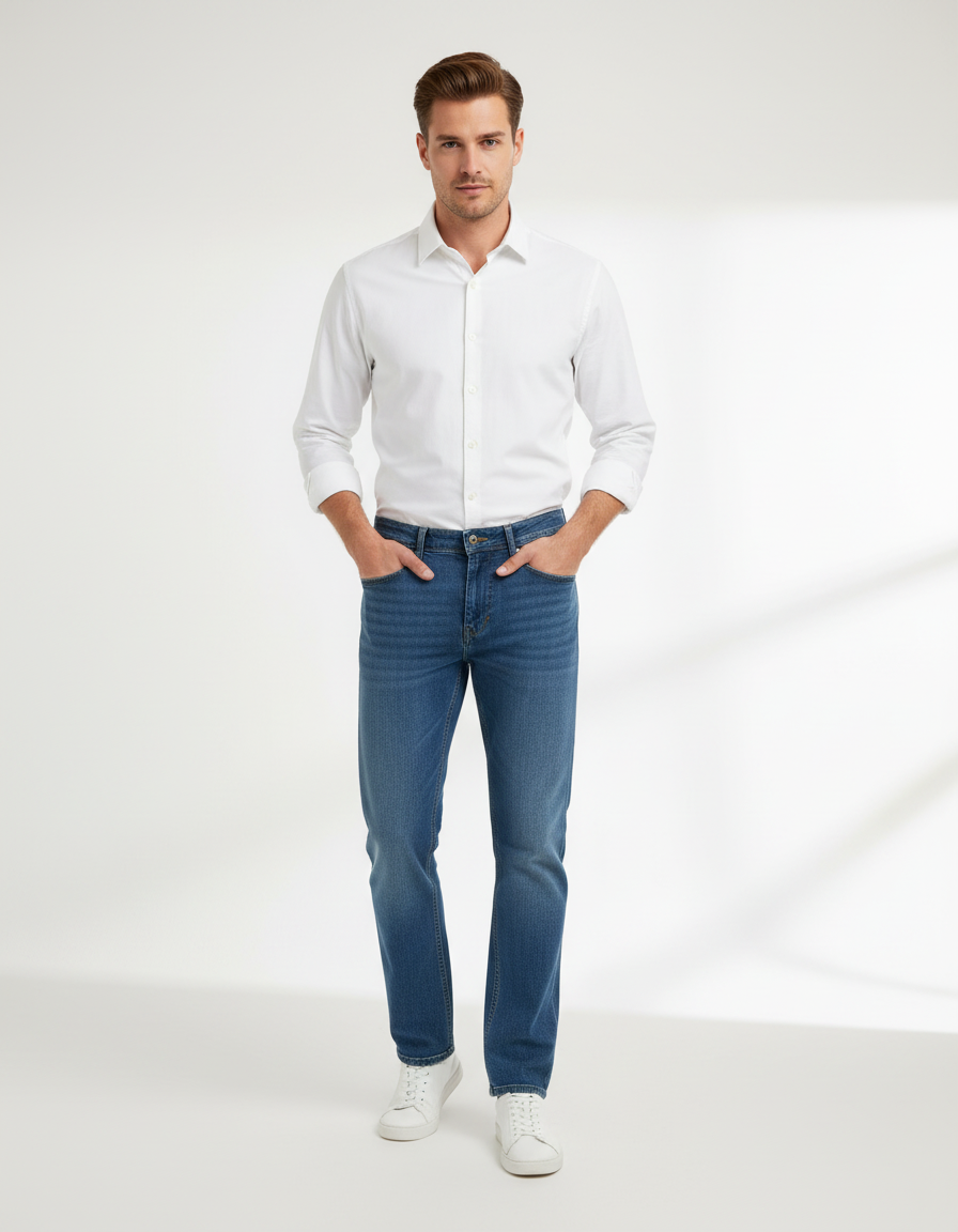 These classic blue denim jeans feature a straight-fit silhouette with a mid-rise waist, offering everyday comfort and a timeless look. Light fading and subtle whiskering on the front add a casual, lived-in feel. Designed with five functional pockets, button-and-zip closure, and sturdy double stitching, they’re durable enough for daily wear. Ideal for pairing with tees, shirts, or jackets for both casual and semi-casual outfits.