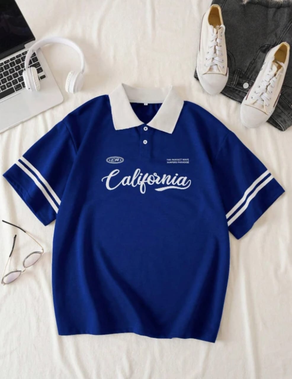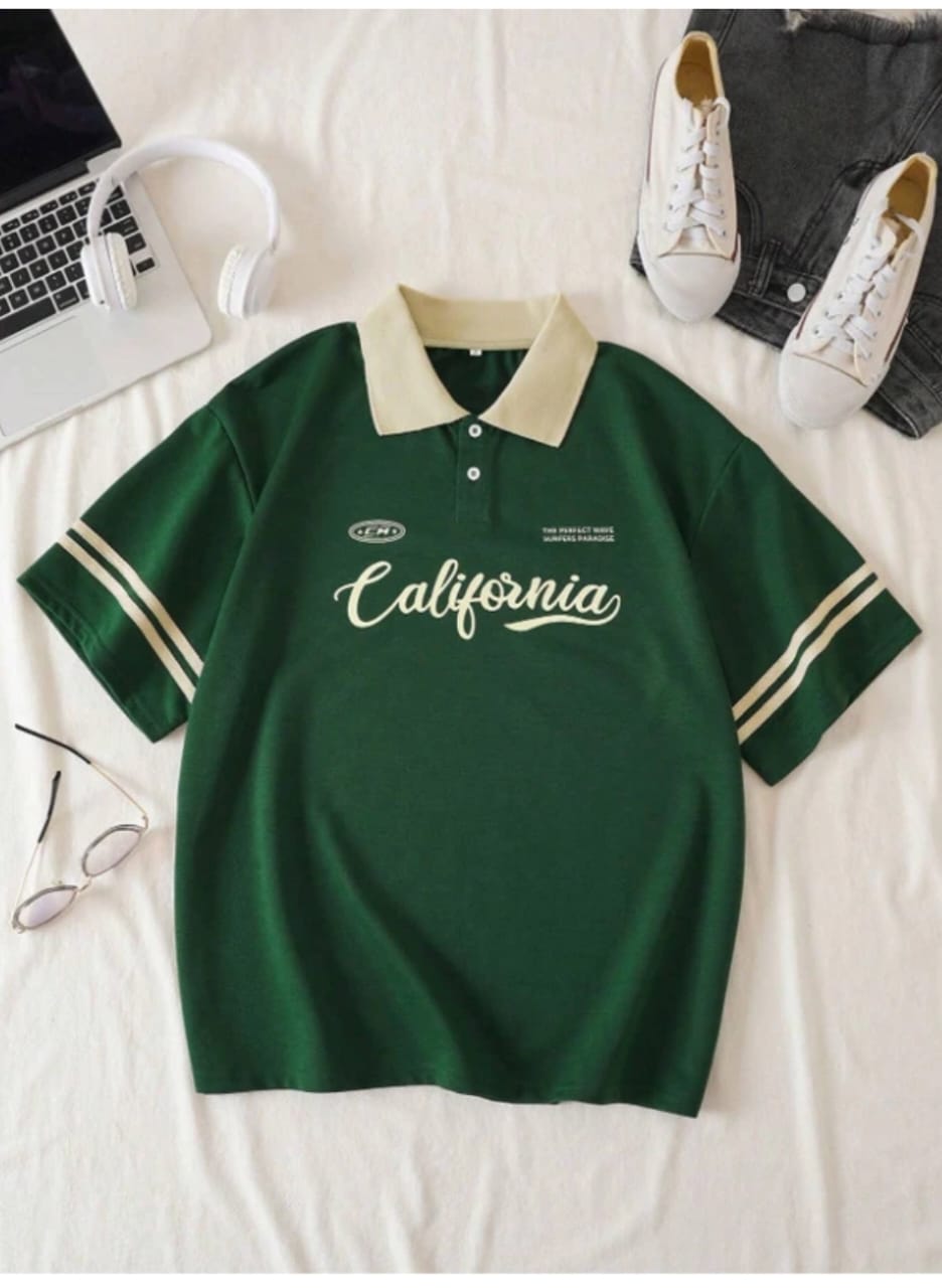 Make a bold statement with this oversized polo t-shirt, featuring classic stripes on the sleeves and a large “California” print at the front. This retro-inspired design brings laid-back West Coast vibes to your casual wardrobe, perfect for pairing with denim shorts, jeans, or sneakers for a fresh everyday look.