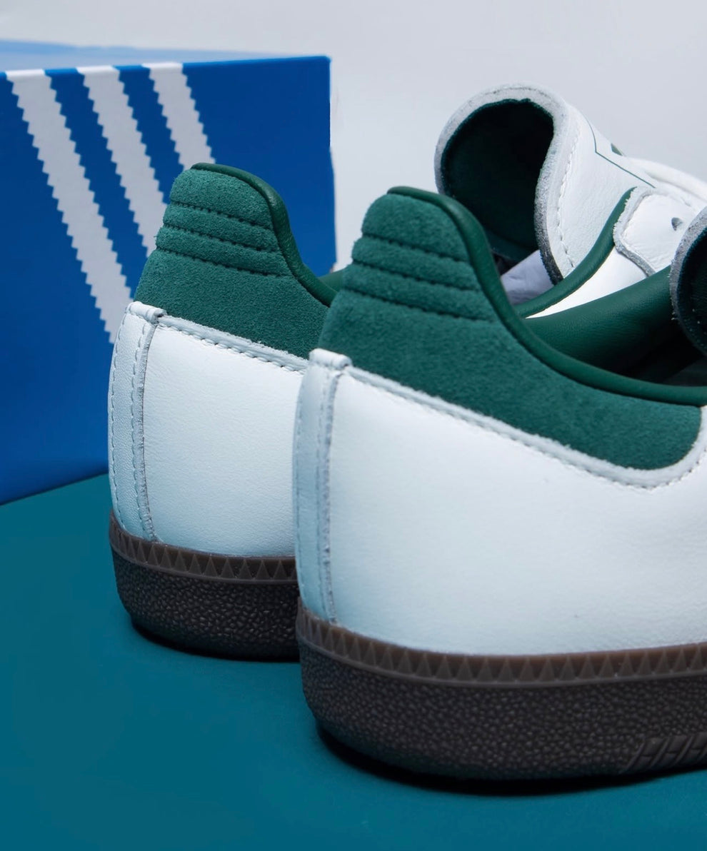 The adidas Samba OG “White Navy Collegiate Green” brings a fresh, sporty twist to the classic silhouette. Featuring a white leather upper with navy and green 3-Stripes detailing, it’s finished with a vintage gum sole for timeless appeal and everyday comfort.