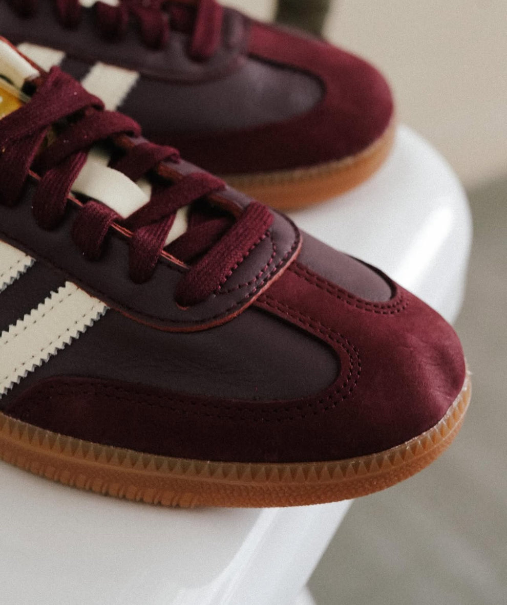 The adidas Samba OG “Maroon Gold Metallic” features a rich maroon leather upper accented with gold metallic Three Stripes and heel tab. Its vintage gum sole and timeless design deliver a perfect mix of classic style and premium detail.
