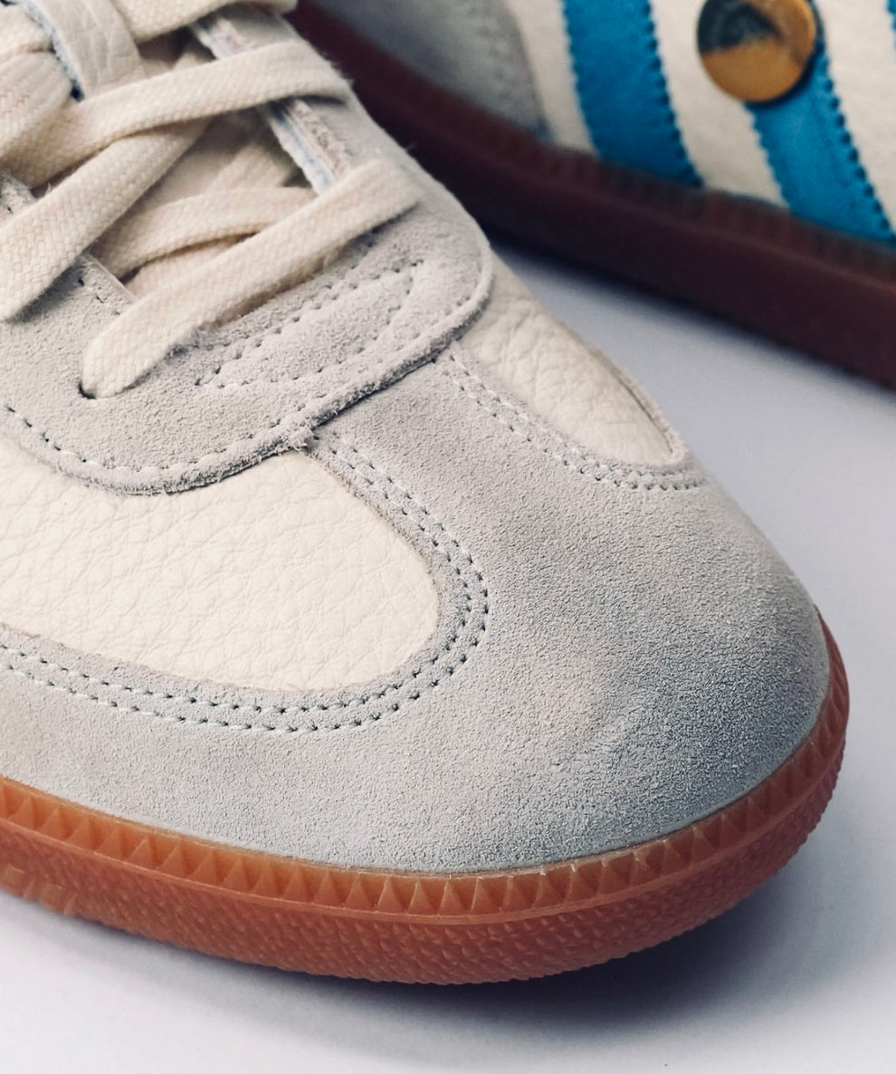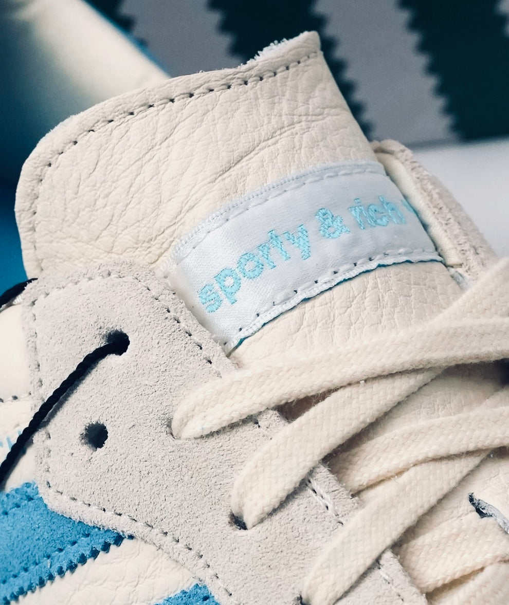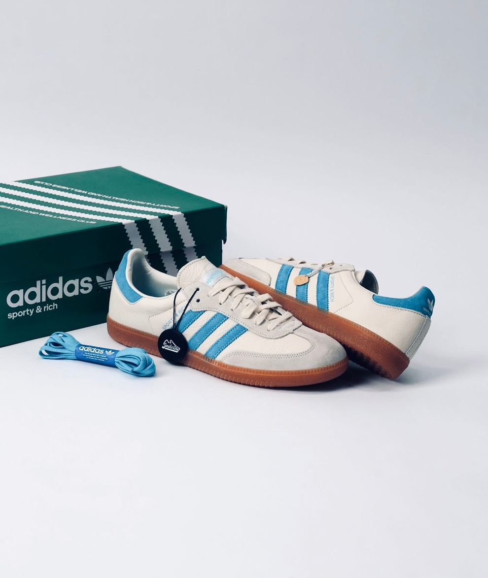 The adidas Samba OG x Sporty & Rich “Beige Blue” blends retro style with modern luxury. Featuring a soft beige leather upper, blue 3-Stripes, and co-branded gold detailing, it sits on a vintage gum sole for a timeless, elevated look.