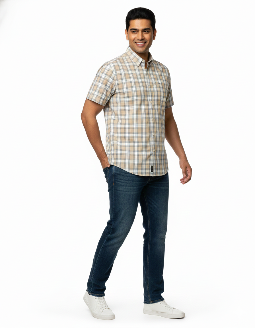 This men’s beige and blue checked half-sleeve shirt offers a fresh, comfortable style for everyday wear. Designed with a classic check pattern and a relaxed regular fit, it delivers a smart yet casual look that’s perfect for warm days. Made from soft, breathable fabric, the shirt keeps you comfortable throughout the day while maintaining a neat appearance.
