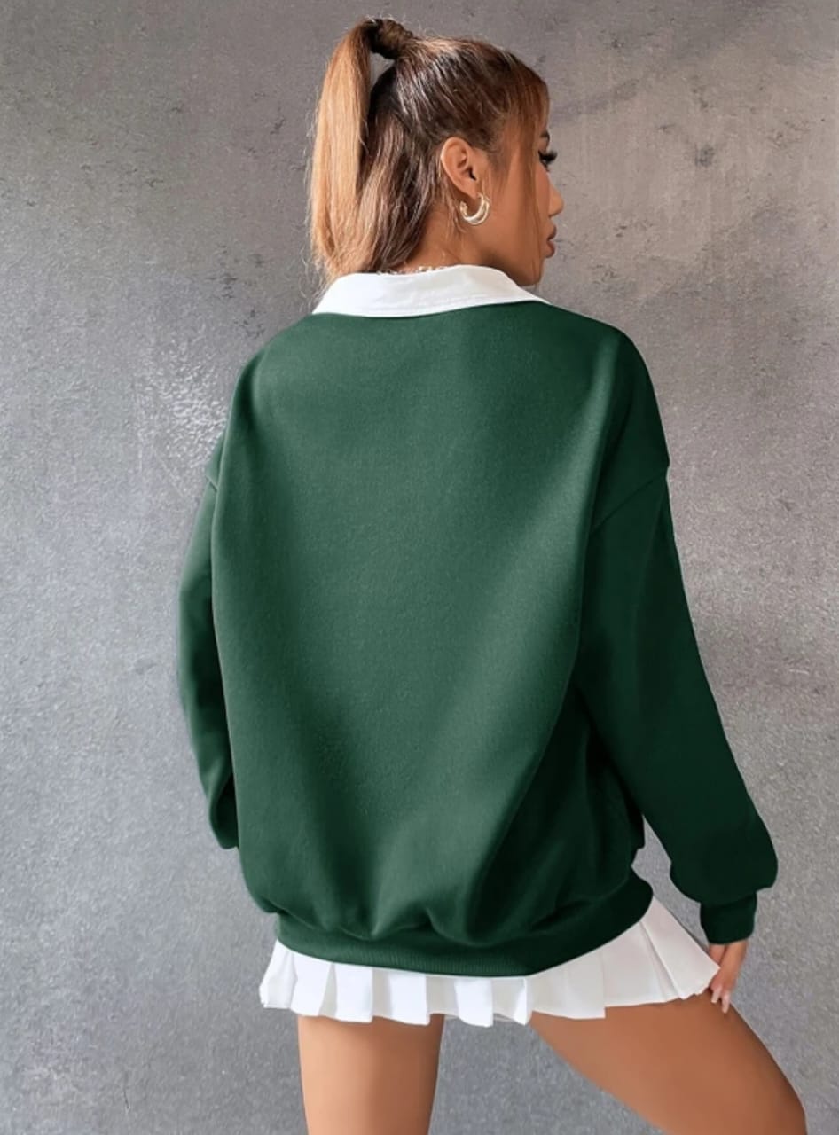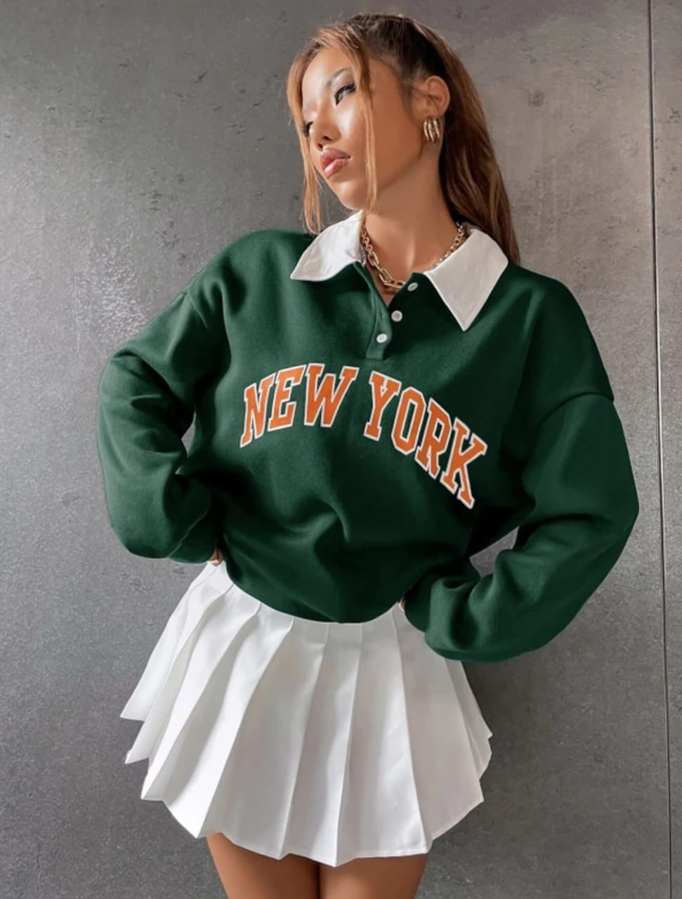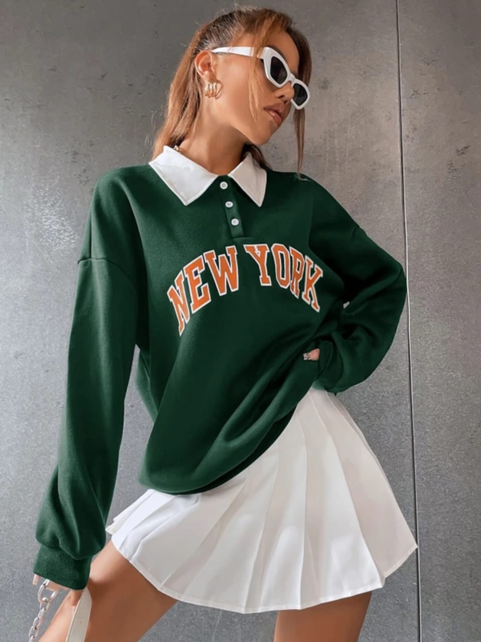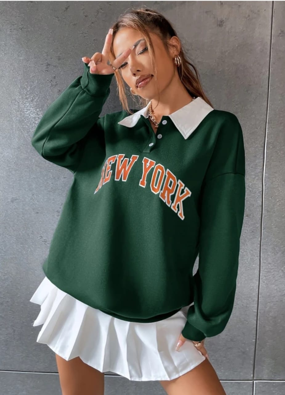 This women’s long-sleeve sweatshirt features a relaxed, drop-shoulder fit with a crisp contrast shirt collar that gives a layered look without extra bulk. Crafted from soft, medium-weight fleece fabric, it includes ribbed cuffs and hem for a neat silhouette and showcases a bold “NEW YORK” varsity-style front print on the black option, with solid sky blue and forest green colorways for versatile styling.