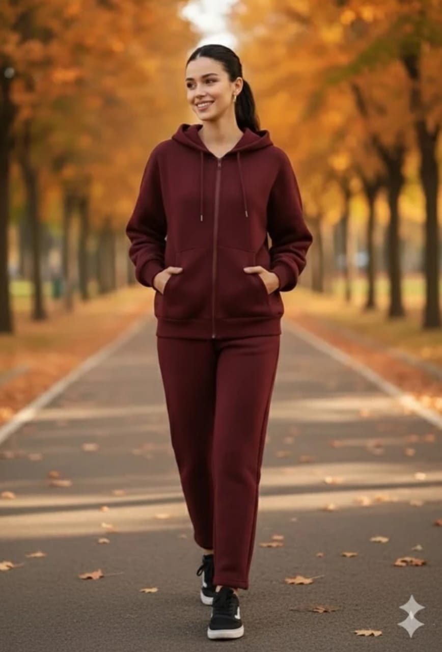This women’s fleece zip-up hoodie features a relaxed, straight-cut silhouette with a full front zipper, adjustable drawstring hood, and split kangaroo pockets for everyday practicality. Made from soft, medium-weight fleece, it provides reliable warmth without feeling bulky, making it ideal for city walks, travel, and casual lounging in cooler seasons. Available in deep navy, classic black, and rich burgundy, it pairs easily with matching joggers or jeans for a coordinated off-duty look